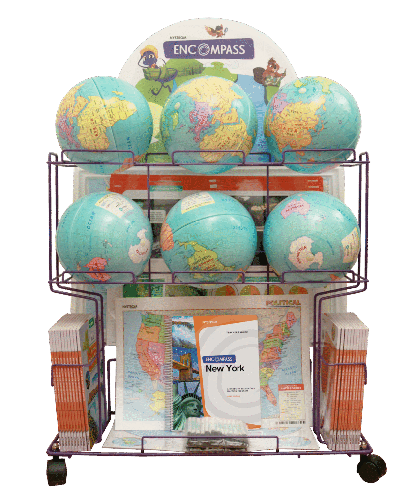 A classroom cart with all the components: student atlases and markable kid-sized globes, Social Studies Place Mats, and desk maps scaffolded for K–5.