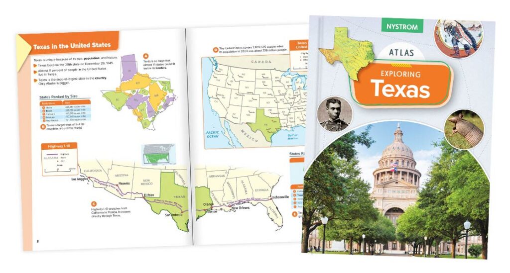 Fourth graders go on a journey through Texas with Encompass: Exploring Texas, Grade 4 – this program features TEKS-aligned activities and an atlas, desk map, and place mat focused on Texas to engage students while developing essential skills in geography and history.